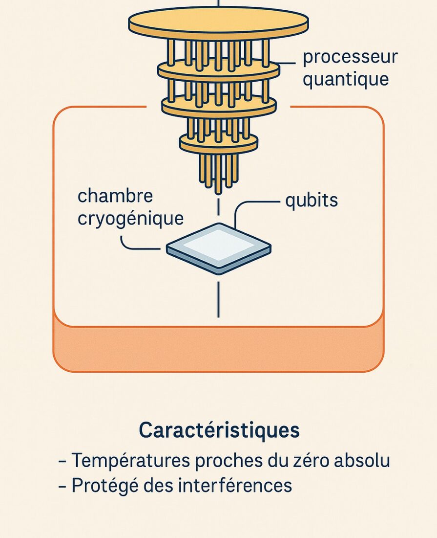 Mais cette puissance, aussi fascinante soit-elle, tient sur un fil. Un qubit est une entité extrêmement sensible. Le moindre bruit ambiant, une infime variation de température, un champ magnétique ou une vibration mécanique peut perturber son état. C’est ce qu’on appelle la décohérence : le moment où le qubit perd ses propriétés quantiques et devient inutilisable. Pour éviter cela, les processeurs quantiques doivent être maintenus dans des conditions extrêmes. On les place dans des chambres cryogéniques, à des températures proches du zéro absolu, soit environ -273,15 °C. À cette température, les atomes cessent presque de bouger, ce qui réduit considérablement les interférences. Les qubits doivent aussi être isolés dans des environnements ultra-propres, protégés des rayonnements, des ondes radio et même des vibrations produites par des pas dans un couloir adjacent. Ce sont des machines à la fois délicates et coûteuses, suspendues dans de grandes structures métalliques qui ressemblent à des chandeliers de science-fiction.