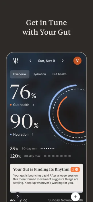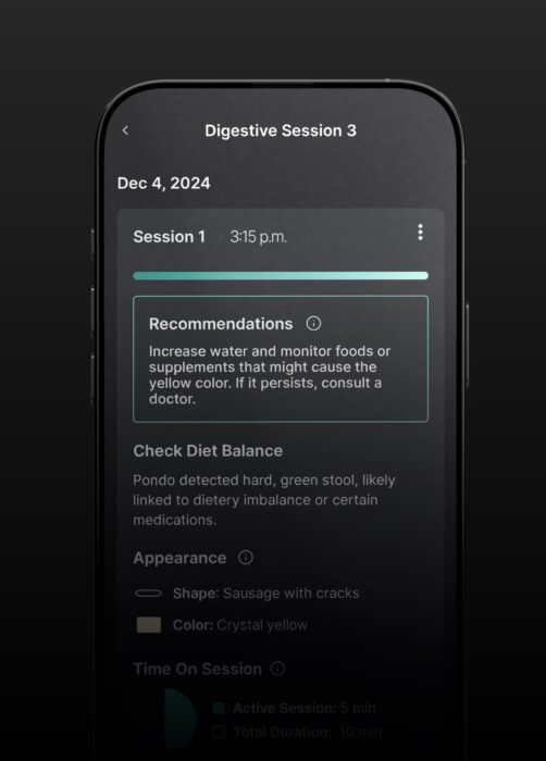 Juste un peu plus loin, Pondo adopte une approche similaire, mais avec une promesse de simplicité encore plus marquée. Son capteur analyse automatiquement l’urine et les selles, sans contact, et résume le tout en deux indicateurs principaux. Un score de digestion et un score d’hydratation.